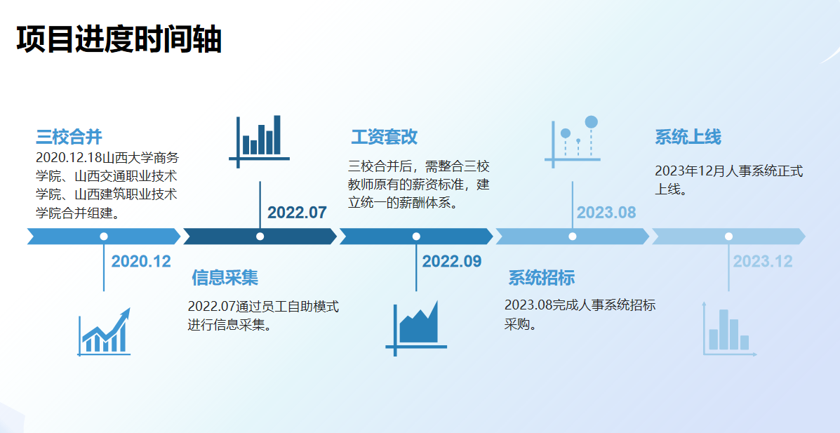 山西工程科技职业大学是2020年由山西大学商务学院、山西交通职业技术学院、山西建筑职业技术学院合并组建,三校合并后,为提升管理效率、优化资源配置,学校决定搭建人力资源一体化管理平台,旨在实现教师基础人事、职称评审等业务的线上化处理,打通部门间数据壁垒,促进协同办公。同时,借助平台的数据分析功能为学校决策提供有力支撑,优化人才结构,并通过员工自助服务提升教职工的使用体验,推动人力资源管理向数字化转型。
